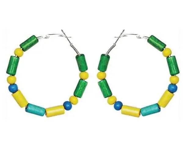 Beautifully handcrafted with yellow, green, and blue wooden beads inspired by the Brazilian flag, these hoops honor South American culture, Carnival spirit, and passionate soccer fandom. Designed with a secure clasp on a 50 mm silver steel hoop, they are lightweight, travel-ready, and perfect for World Cup fan zones, match parties, Brazilian festivals, parades, or everyday wear as a bold cultural keepsake.